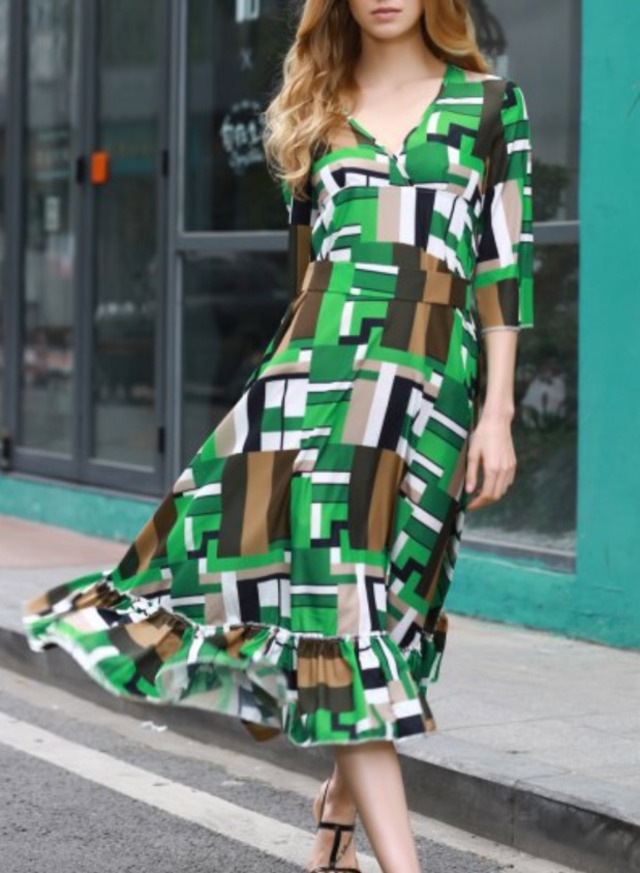 【日本人に似合うグリーン♡】 ブラウンベースのブロッキングデザインに フレッシュなグリーンが差し色に♡ 袖も裾少し長めでエレガントなデザイン♡ 裾にはラグジュアリーなフリルが歩くたびに揺れる 大人なデザインです♡S