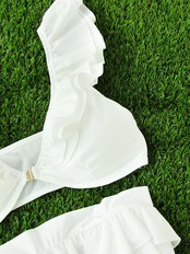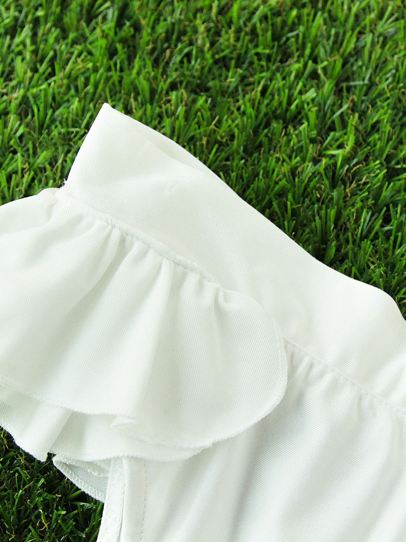 深いVネックのラインに、ホワイトのビッグフリルがついている